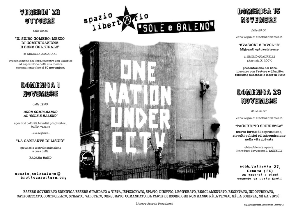 Sono tempi caratterizzati dalla propaganda della paura e dalla spasmodica ricerca della "SICUREZZA". Viene indotta la sensazione di sentirsi minacciati da ogni genere di pericoli e di emergenze: microcriminalità, fondamentalismi religiosi (rigorosamente islamici), accattonaggio minorile, traffico di droga, venditori ambulanti, merci contraffatte, immigrazione clandestina: la "percezione di insicurezza", l'ultimo grido tra le paranoie imposte dalla società dello sfruttamento, è in costante impennata. Da un lato si fomentano e si assecondano le paure razziste della gente “perbene”, dando loro in pasto un nemico creato ad arte (il pericoloso straniero, per esempio) su cui lasciar accanire i vendicatori in divisa; dall'altro accelera la creazione di categorie sociali come quella del "clandestino", inevitabilmente costringendoli ad accettare qualsiasi tipo di ricatto sociale ed economico, costretti a nascondersi e ad essere bersaglio quotidiano di razzisti, fascisti e poliziotti. La risposta più sensata allo stato di cose attuale è riconoscere i propri nemici negli stati, nelle loro frontiere, nelle loro polizie, nel sistema economico del profitto e del consumo che produce miseria e disperazione. E nel cominciare a riprenderci i nostri spazi di libertà, fin da subito, proprio come vogliamo fare noi, organizzando una assemblea pubblica in piazza Saffi, per smontare i luoghi comuni dei profeti della paura; la piazza, il luogo dove da sempre si discute e ci si confronta tra pari, è già morta, facciamola vivere noi.