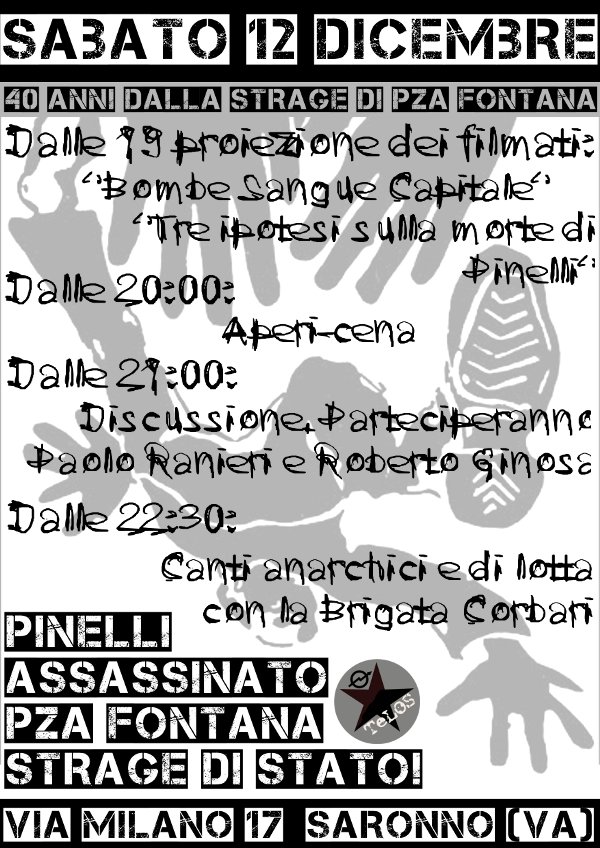 *Sabato 12 Dicembre: dalle 19: proiezione dei filmati "bombe sangue capitale" e "tre ipotesi sulla morte di Pinelli" dalle 20:00 Aperi-cena Dalle 21:00 Discussione. Parteciperanno Paolo Ranieri e Roberto Ginosa Dalle 22:30 Canti anarchici e di lotta con la Brigata Corbari Allegata la locandina Start: 20:30