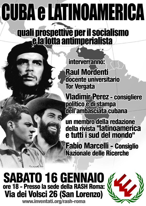Sabato 16 gennaio, in via dei volsci 26 alle ore 18:00, si terrà l’iniziativa promossa dalla Rash Roma: “Cuba e America Latina: quali prospettive per il socialismo e la lotta antimperialista”, quest’iniziativa ha come obiettivo principale quello di analizzare politicamente e socialmente ciò che sta accadendo oggi in America latina e il ruolo di una Cuba che festeggia proprio in questi giorni il 51°anniversario della gloriosa rivoluzione socialista portata alla vittoria da punti di riferimento globali della lotta rivoluzionaria e antimperialista quali Che Guevara e Fidel Castro, il cui pensiero e pratica politica sono stati citati recentemente come linee guida anche dal presidente della repubblica bolivariana del venezuela Ugo Chavez nel manifesto programmatico della neonata 5°Internazionale da lui fondata e sostenuta che tante speranze sta dando ai lavoratori e ai rivoluzionari di tutto il mondo.
