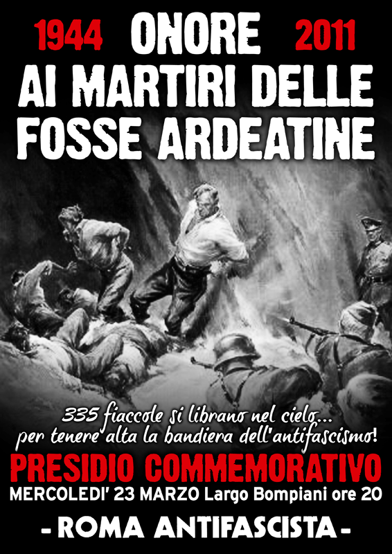 24 marzo 2011, a 67 anni dal martirio, la loro memoria sarà infangata, ancora una volta, come accade di frequente negli ultimi anni, la nostra città si appresta a fare da ribalta per neonazisti, revisionisti di ogni specie e persecutori di partigiani. In questo caso, per l’appunto il 24 marzo, lo sponsor di questi signori sarà niente meno che l’Università Roma Tre, pronta a patrocinare un convegno-farsa sul futurismo con un manifesto sul quale campeggia in bella mostra il faccione di Benito Mussolini. Bel modo di rendere giustizia ai caduti antifascisti, ai caduti di Roma. Sia chiaro, dicendo questo non intendiamo piagnucolare per la scarsa sensibilità mostrata dalle Istituzioni (municipali e culturali) sulla questione memoria, oramai, ci abbiamo fatto il callo e non proviamo nessuna fiducia per chi ha gettato sul lastrico il museo della Liberazione di via Tasso, sabotato le commemorazioni dei rastrellamenti nazisti nei quartieri ed alle stesse Ardeatine. Ci piace, invece, che tutti sappiano che fine abbia fatto il “ribellismo” dei vari futuristi, Casapound ed amichetti assortiti pronti a gettare la maschera della sovversione per i trenta denari di Alemanno & co. Ai fa$cisti del III° milennio, ai loro protettori in doppiopetto, alla giunta comunale del clientelismo, dei Mokbel, degli Andrini, dei Lucarelli risponderemo facendo librare, il 23 sera, 335 lanterne volanti nel cielo di Roma affinché le fiamme dei caduti antifascisti illuminino a giorno la nostra città strangolata dalle trame nere, che il loro sacrificio non sia stato vano. ROMA E’ STATA, E’, SEMPRE SARA’ ANTIFASCISTA.