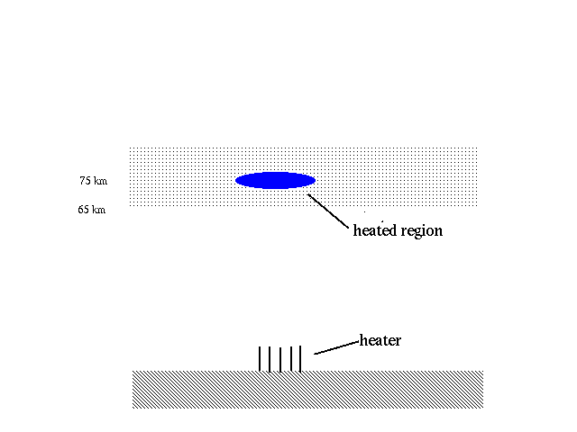 The electrojet is modulated by using a high frequency heater (a few MHZ) with the power modulated at the desired ELF/VLF frequency to heat the ionospheric electrons in the lower D-region. Figure 1a shows a sketch of the heater and heated region. The heated region is typically at 75 km (though this depends upon the carrier frequency) and can be 30 km in diameter and a few km thick. Viewed from above (see Figure 1b) the heated region is a roughly circular patch. The smoothness of the heated region depends upon the antenna radiation pattern as well as D-region conditions. The heating increases the electron-neutral collision rate which changes the conductivities. Since on ELF time scales the ambient electric field is constant, modulating the conductivity produces a current modulated at the same frequency. At these altitudes the conductivity change is predominantly in the Hall conductivity. If the ambient electric field, E, is in ±y direction, a time varying current perturbation is generated, j, in the ±x direction (Fig. 1b). The time varying current launches waves both up and down the Earth's magnetic field. In the simulations shown here, we start with a time-varying current and study the downward propagating waves and how they couple into the Earth-ionospheric wave guide.