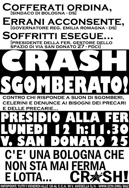 Lunedi 12 ore 11.30 presidio contro lo sgombero del Laboratorio del precariato in lotta CRASH! sotto la sede della FER in via san donato 25