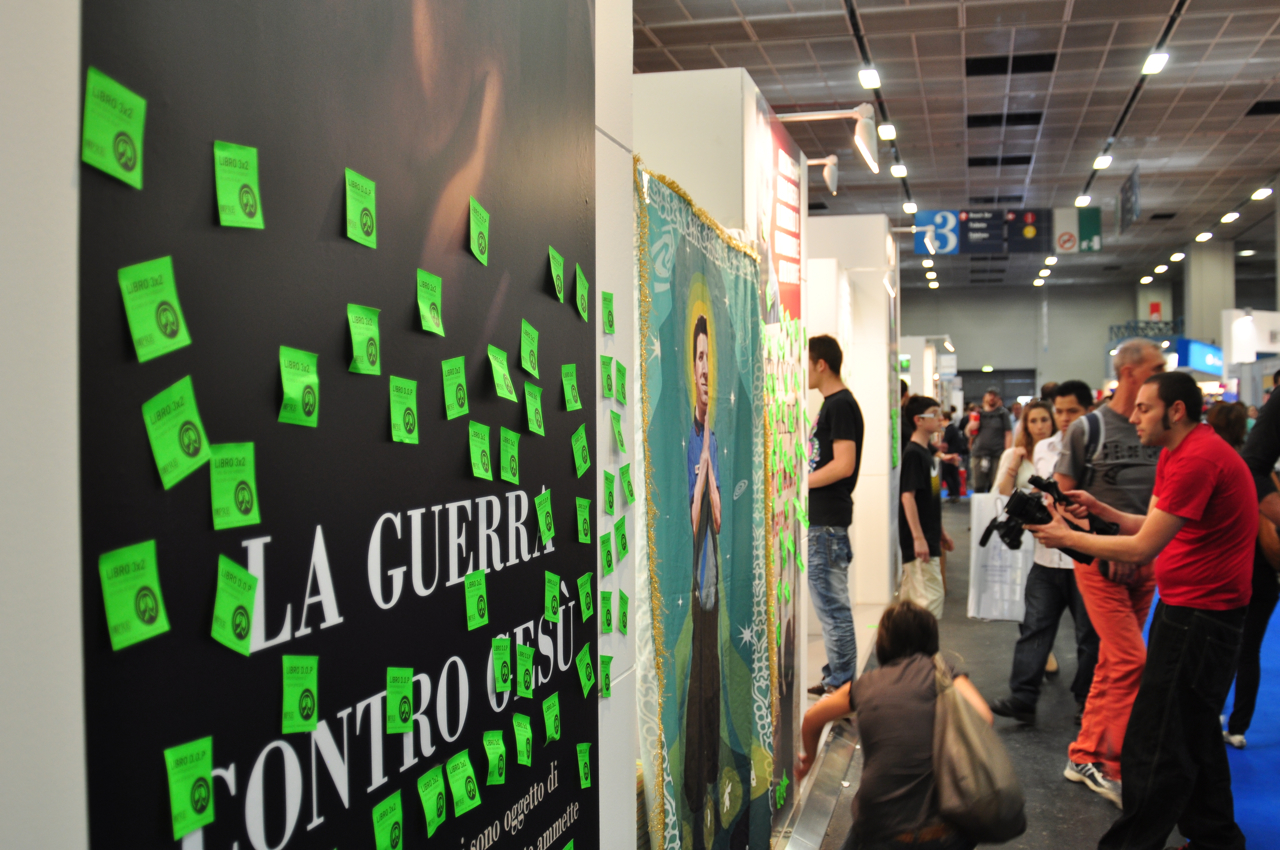Una ventina di devoti torinesi del Santo hanno distribuito una lettera ai lavoratori ‘gli elettricisti, i magazzinieri, i montatori, le hostess e gli steward, gli stendisti, gli addetti alla sicurezza, gli uscieri, gli addetti stampa, gli addetti alle pulizie, i pubblicisti e i redattori come te sono gli elementi fondamentali per la buona riuscita del Salone. Senza di voi semplicemente la Fiera non sarebbe possibile.’ E continuava ‘Pensi che il valore che rappresentate in questa occasione vi sia stato riconosciuto correttamente? Pensi di essere stato adeguatamente tutelato e ricompensato per il lavoro che hai svolto? Oppure qualcuno ne ha approfittato? … Scrivici a sanprecario@csoagabrio.info oppure passaci a trovare il lunedì o il giovedì dalle 18:30 alle 20:30 in via Revello 5 presso il centro sociale occupato autogestito Gabrio’.