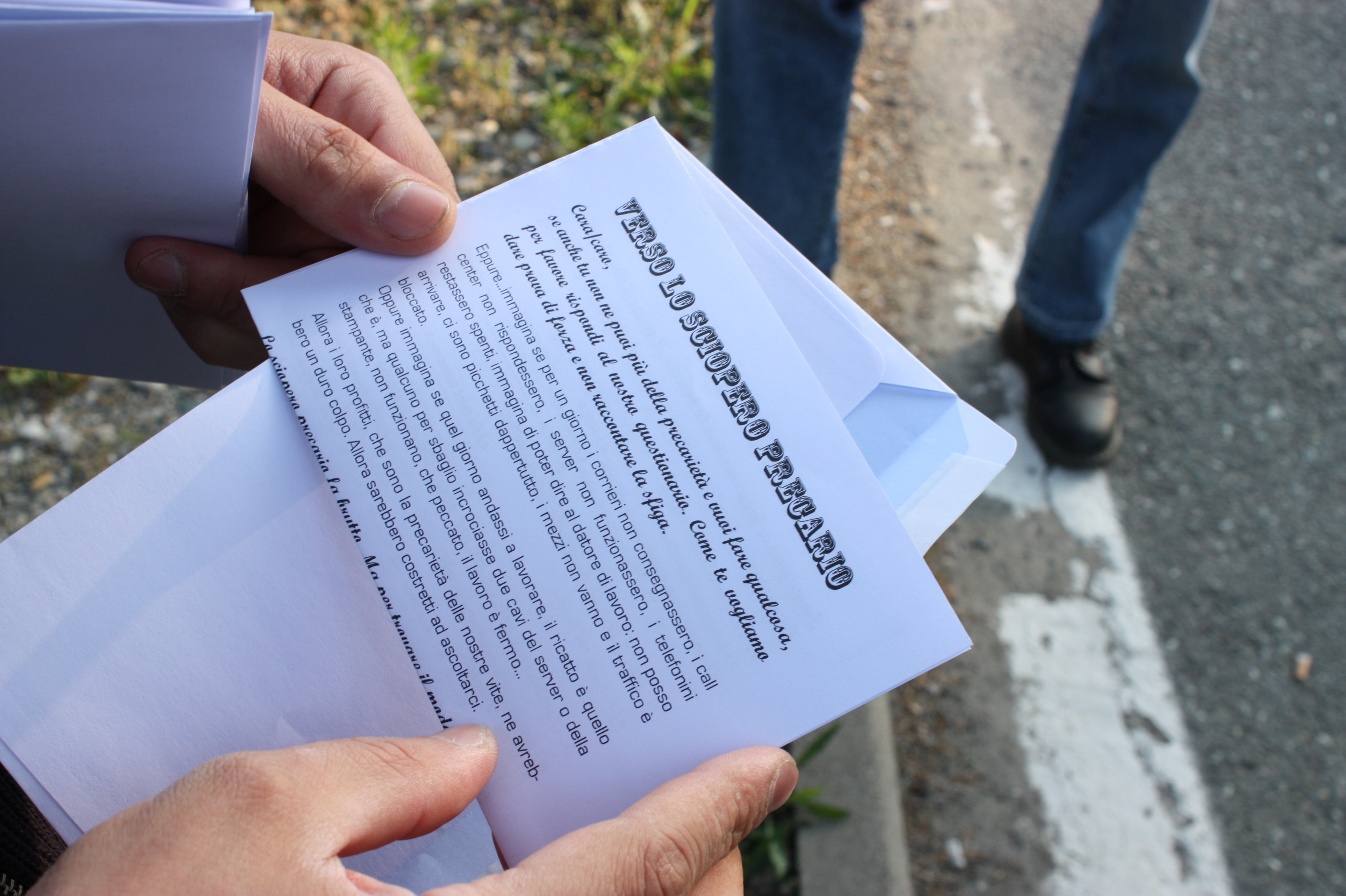 La busta conteneva anche il questionario precario strumento studiato e distribuito durante la MayDay milanese per costruire insieme ai precari lo sciopero precario del prossimo autunno.