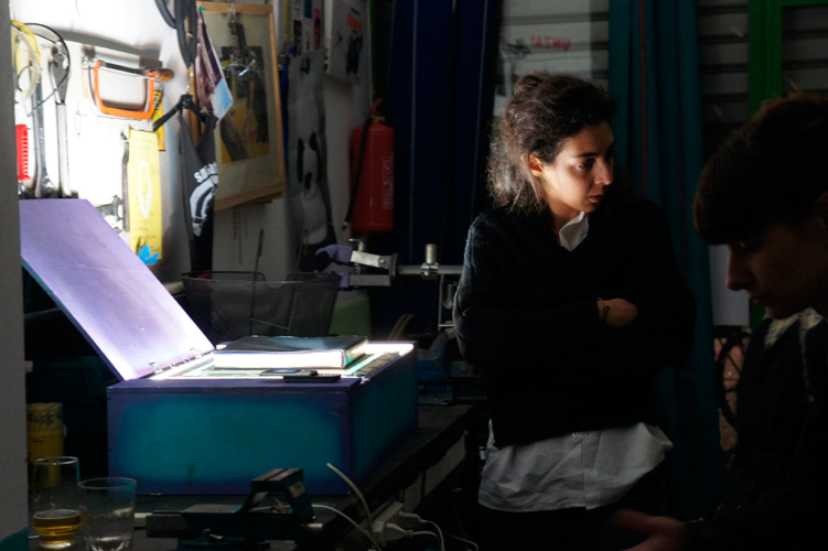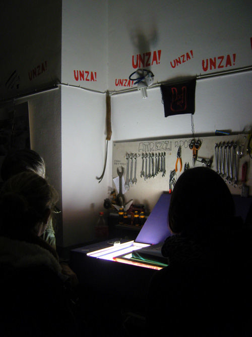 Ancora molto partecipata la seconda serata dedicata alle bici + serigrafie + taglia&cuci, avvenuta ieri alla ciclofficina Unza!. Insieme abbiamo sperimentato il procedimento per impressionare i disegni dei partecipanti dalla pellicola al telaio — già spalmato di gelatina fotosensibile, ben asciugata dal giorno prima — con l’ausilio del bromografo autocostruito dagli operosi amici La Sericletta, che gestiscono la cicloffina durante le domeniche e il laboratorio di serigrafia nei martedì sera.