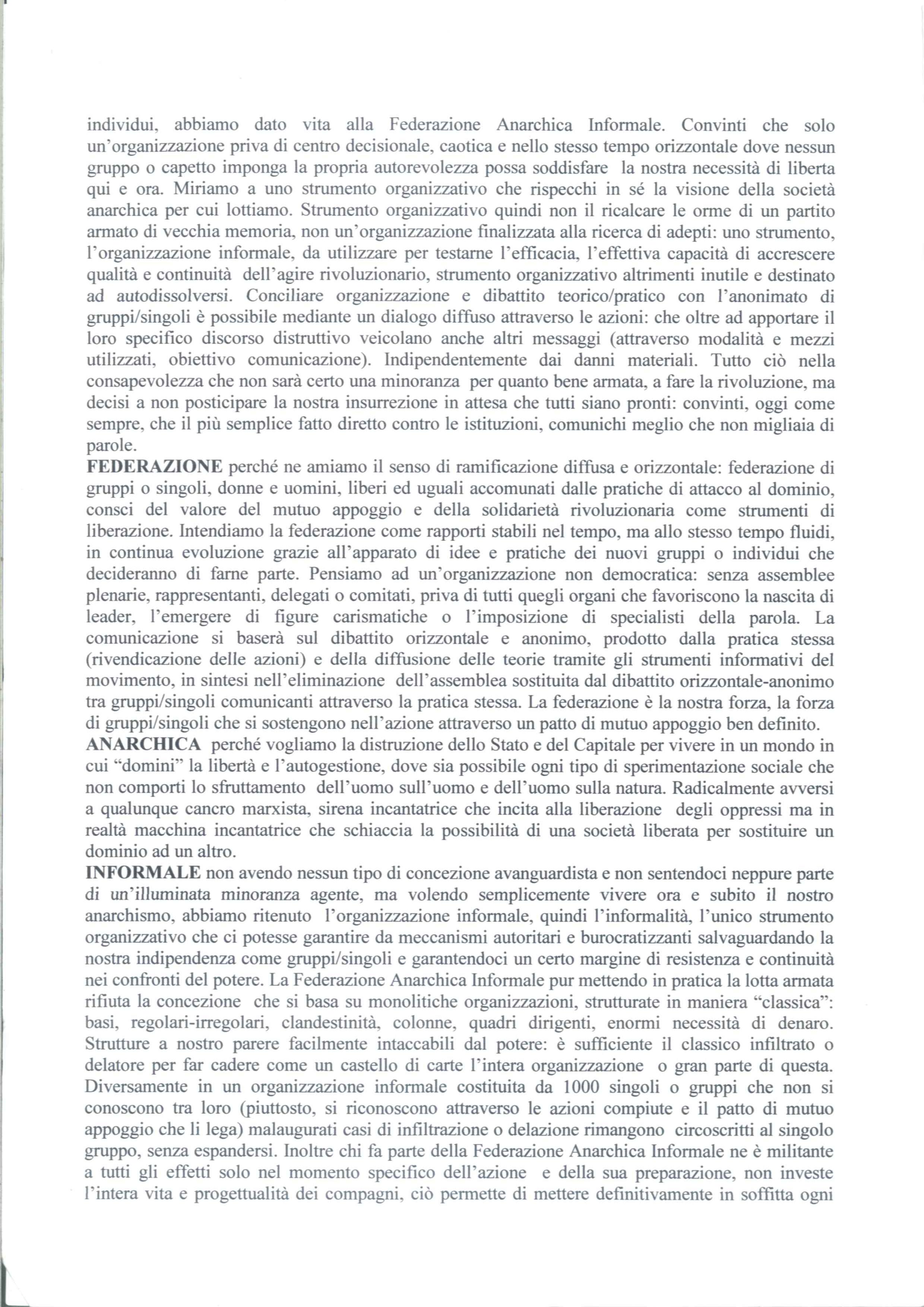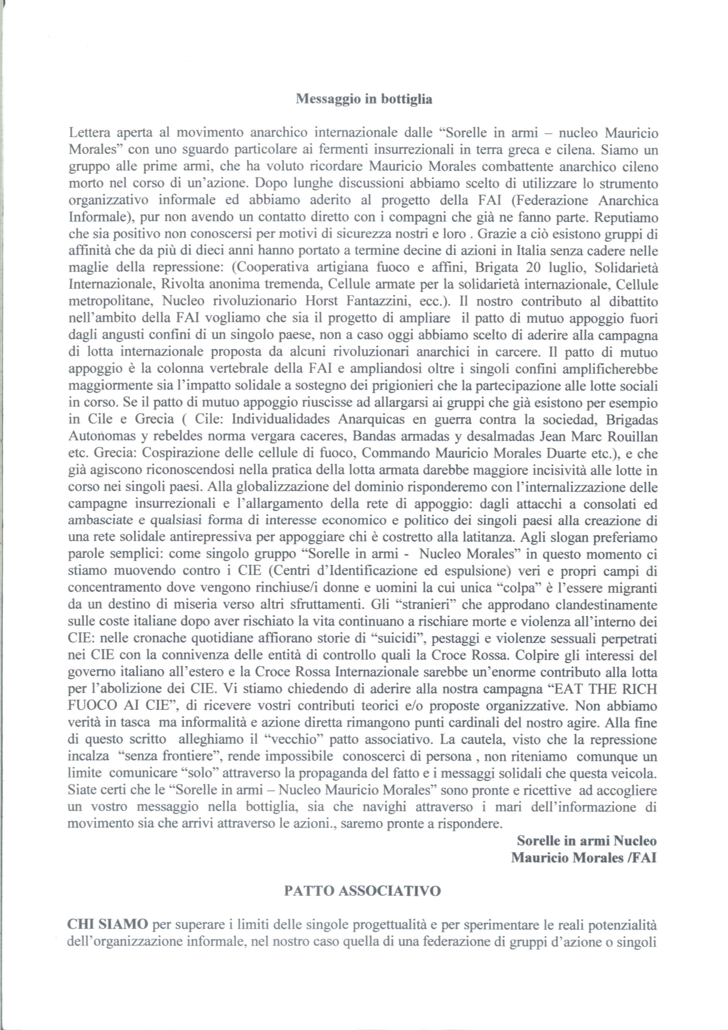 Pubblichiamo la scansione di un documento pervenuto per via epistolare nei giorni scorsi a diverse realtà anarchiche e di movimento in giro per l'Italia