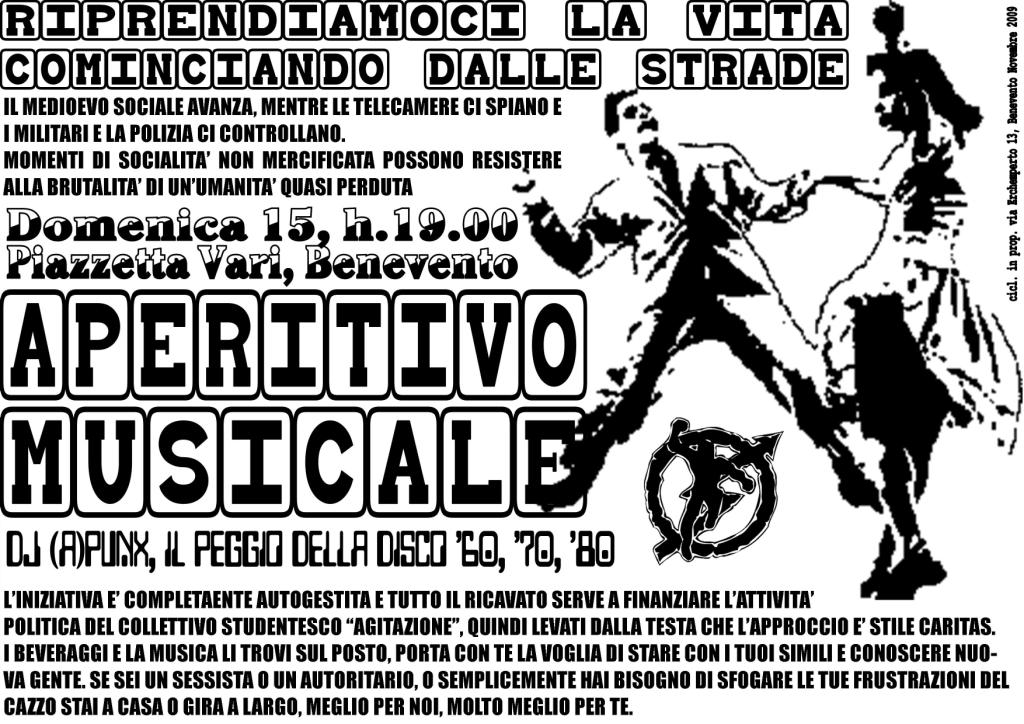 Domenica 15 Novembre APERITIVO MUSICALE (dj (A)punx, il peggio della disco '60/'70/'80) TUTTO IL RICAVATO SERVE A FINANZIARE L'ATTIVITA' POLITICA DEL COLLETIVO *in caso di pioggia si danza con l'ombrello! in allegato il flyer Start: 20:00