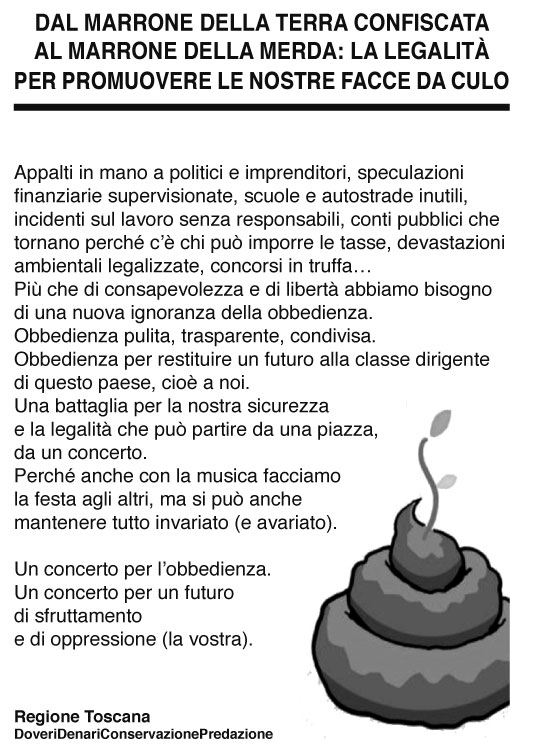Un volantino CONTRO la legalità - che fa il verso a una cartolina PER la legalità diffusa dalla regione Toscana per pubblicizzare una serie di iniziative che si terranno a Firenze dal 22/9 al 19/12/2009 - distribuito nel corso della prima serata in piazza Santa Croce.