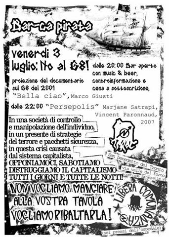 dalle Ore 21:00 Anche in caso di pioggia…Tanto si trova un posto al riparo… dalle ore 19:00 Ascolta :Radio Blackout 105:250 FM Visto le minacce di sgombero degli Squat torinesi, e la repressione contro Radio Blackout,da parte del sindaco Sergio Chiampraino, stiamo preparando una serie di serate in giro per la città... Così si abitueranno a vederci in mezzo alla strada... Presto vi faremo sapere il programma completo. | ||