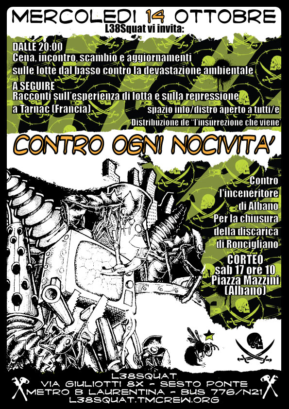 Mercoledì 14 Ottobre, CONTRO OGNI NOCIVITA' A seguire: Racconti sull'esperienza di lotta e la repressione a Tarnac [Francia] Spazio info/distro aperto a tutte/i Contro l'inceneritore di Albano, per la chiusura della discarica di Roncigliano | ||