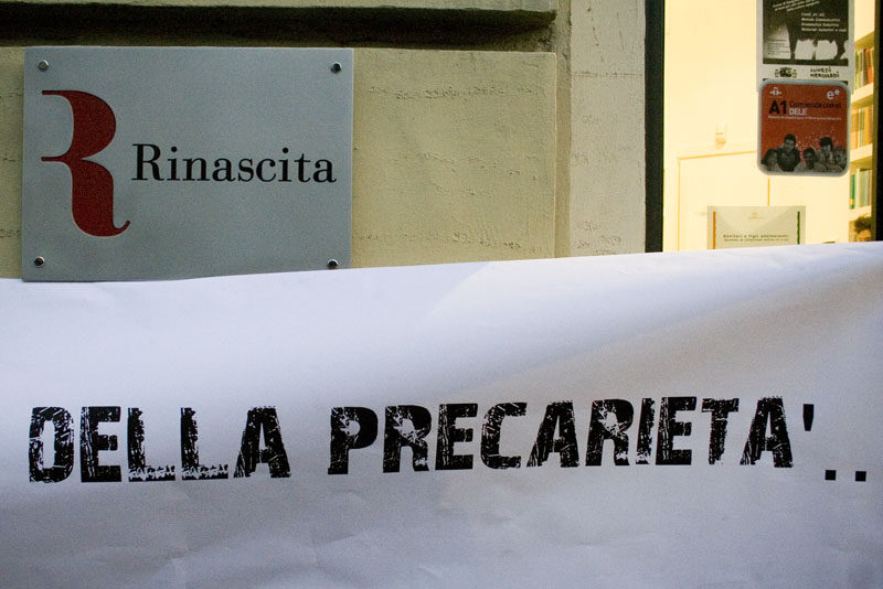 22 marzo 2011: accompagnsati dal chiarissimo slogan “Sciopericchio del 6 maggio, si può fare di più. Voglia di sciopero precario” i Punti San Precario sono entrati nella Libreria Rinascita di via Savoia 30 a Roma, durante la presentazione del libro “La lana della salamandra”. Fra i relatori, la segretaria generale della Cgil cui precarie e precari hanno chiesto di prendere parola sulle condizioni lavorative nelle Librerie Rinascita, già denunciate pubblicamente: impieghi al nero, non pagati da mesi, licenziamenti senza preavviso come in via Ostiense.
