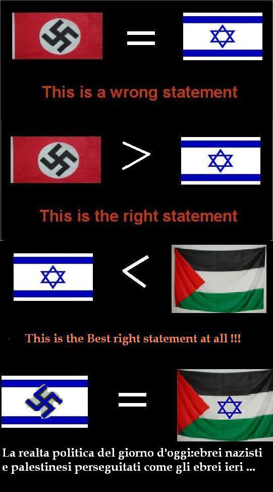 il vostro problema è che siete estremamente fasci dentro;mai che distinguiate tra israele e il popolo ebraico e mai che adoperiate un minimo di misura quando aprite quella fogna di bocca da ultra'che vi ritrovate!Ma voi siete davvero convinti che ci siano i rabbini a capo delle nefandezze mondiali?E magari siete anche un po'mistici:6 milioni di ebrei sterminati diviso 2 che sono i riccioli del rabbino fa tre,come la sacra triade-e quindi c'è in mezzo anche la chiesa- e tre per quattro fa 12,come il giorno della strage di piazza fontana e via dicendo... La vostra foga antiebraica è dovuta solo alla grossolanità della vostra forma mentale:vi vedrei bene in curva coi nazistimerda della lazio,ad urlare in coro ARBITRO EBREO,paghi della vostra appartenenza ad un movimento che di gente come voi-mi auguro-dovrebbe fare volentieri a meno