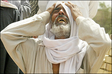 Lunedì 28 aprile, mentre i media statunitensi erano concentrati sulla visita di Donald Rumsfeld a Bagdad, un evento agghiacciante aveva luogo a soli 50 km ad ovest: soldati americani hanno aperto il fuoco sui civili iracheni, uccidendo 15 persone e ferendo decine di dimostranti che protestavano contro l'invasione USA della loro citta'. È difficile ricostruire quello che è successo davvero a Fallujah; le principali fonti di informazione statunitensi si contraddicono tra loro e sono fortemente basate su fonti militari ufficiali. Ma si può trovare un po' di verità esaminando con attenzione le diverse fonti a mezzo stampa. Foto: campo di calcio come cimiterio..