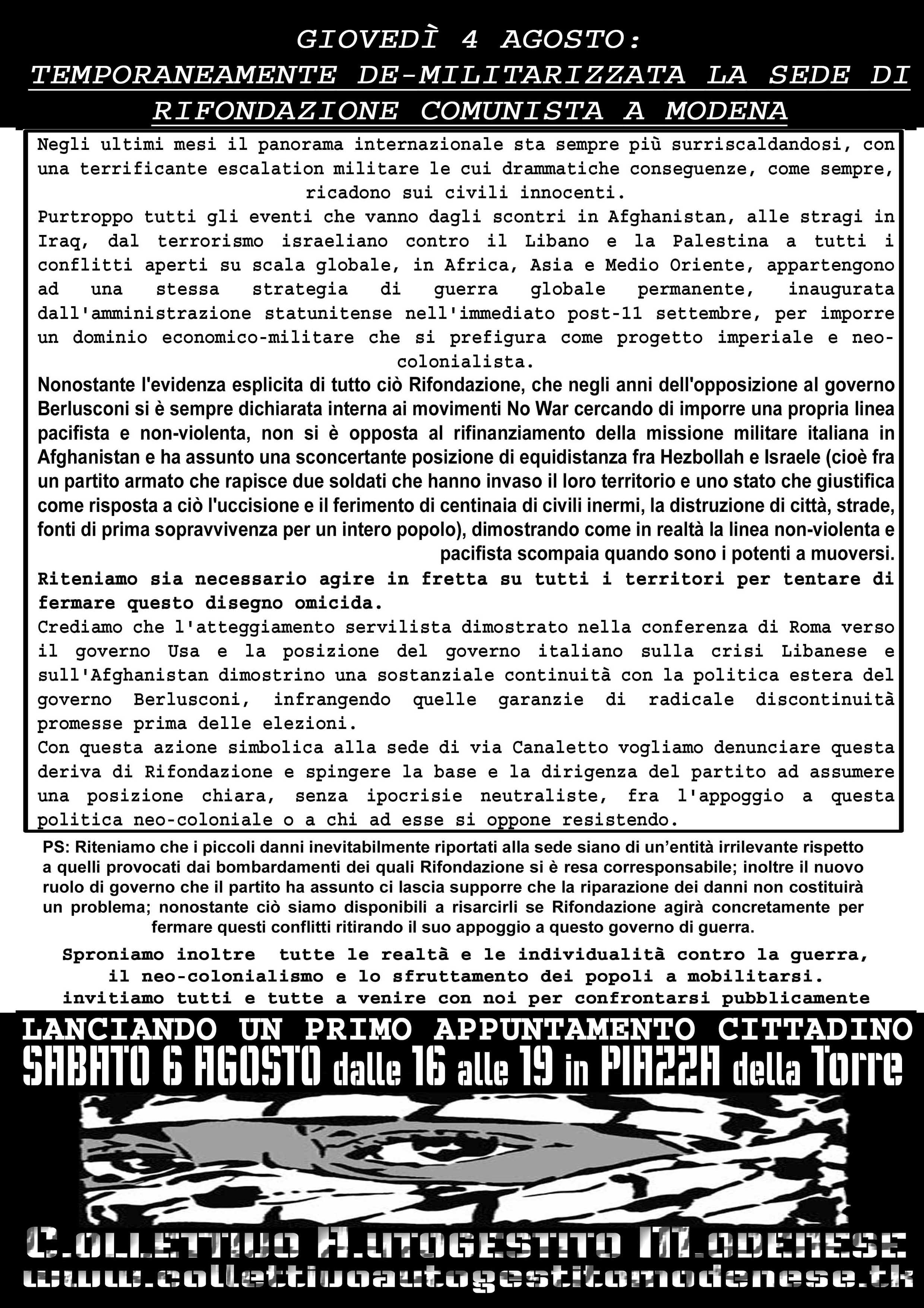 DALLA SEDE DE-MILITARIZZATA DI RIFONDAZIONE COMUNISTA DI MODENA