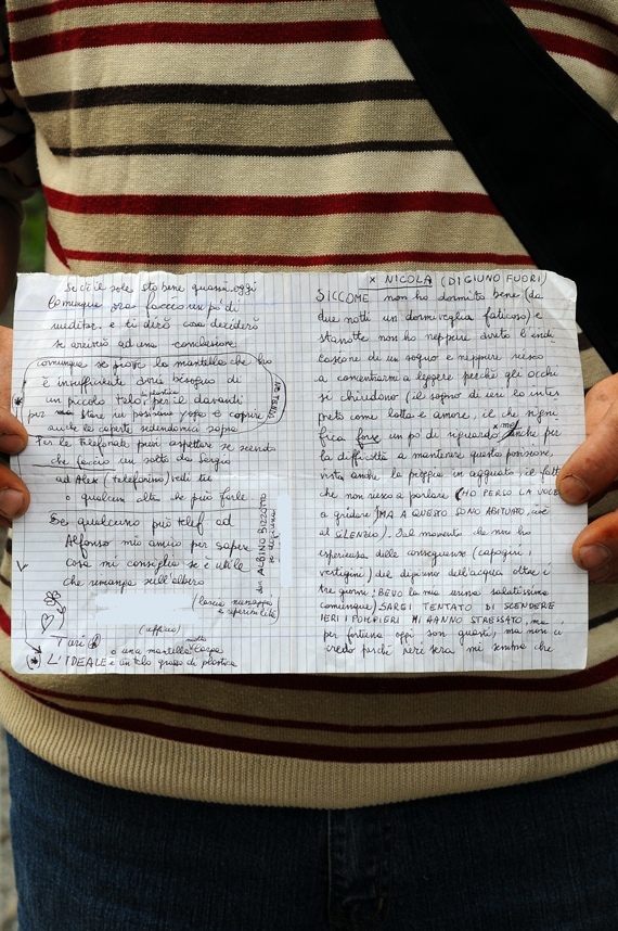 Turi coglie il “nodo del bambù”, l'attimo preciso in cui qualcosa accade, e si arrampica sull'albero all'interno del territorio occupato dalle truppe militari. Vi resterà oltre 50 ore. Al posto giusto nel momento giusto.Turi s'imbozzola sull'albero.Turi sull'albero all'imbrunire.Turi sull'albero con pioggia.Prima lettera di Turi dall'albero (carta 1 recto).Prima lettera di Turi dall'albero (carte 1 verso e 2 recto).Prima lettera di Turi dall'albero (carta 2 verso).Turi sull'albero: preparativi per la notte.I vigili del fuoco si avvicinano a Turi sull'albero.Stop!I vigili del fuoco consegnano a Turi sull'albero una mantella impermeabile fornita dal presidio NO TAV.Turi sull'albero ringrazia.I vigili del fuoco aiutano Turi sull'albero ad assicurarsi per mezzo di una corda.Geometrie esistenziali con Turi sull'albero.Turi sull'albero sorride sotto i baffi.Turi sull'albero. “E così, chi è abile nel dar vita allo straordinario è infinito come il cielo e la terra, inesauribile come il Fiume Giallo e l'oceano. Quando giunge al termine ricomincia daccapo, come l'alternarsi del sole e della luna. Muore e rinasce, come le quattro stagioni” (Sun Tzu). Ciò che il nemico non si aspetta, questo è lo “straordinario”.Turi sull'albero sorprende e mette in crisi le tattiche del nemico. Un'agente digos, conosciuta come “la Mondaini”, chiede istruzioni al comando.La “Mondaini” filma Turi sull'albero.Turi sull'albero domina la situazione e con sussiego rivolge uno sguardo alla videocamera digos.Turi sull'albero in meditazione.Turi sull'albero regala un sorriso al Popolo NO TAV.Lettura pubblica della seconda lettera di Turi dall'albero.Turi sull'albero esegue esercizi yoga.Sulla terra in sintonica risonanza si eseguono tecniche di meditazione yoga.Continua l'esercizio yoga di Turi sull'albero. Nella valle si diffonde un'atmosfera di pace e armonia tra uomo e natura. Le truppe di occupazione vivono preoccupanti momenti di spaesamento.Stallo.Turi sull'albero si rinfresca con un ventaglio ostentando tranquillità e pieno controllo della situazione.Turi sull'albero e la Dora. Panta rei. L'acqua del fiume scorre verso il basso in virtù di una particolare conformazione del terreno e in certe condizioni è capace di trascinare e ammassare le rocce. Non ha una forza propria... con semplicità si adatta a ciò che incontra sul cammino.Turi scende dall'albero. L'arrivo di don Ciotti direttamente da Palermo sancisce la vittoria.Turi vola.Turi atterra plasticamente.Turi è sceso in terra.Turi si accinge a camminare sulle acque.Turi torna tra il Popolo NO TAV.Turi ascolta don Ciotti.Don Ciotti Bloc.