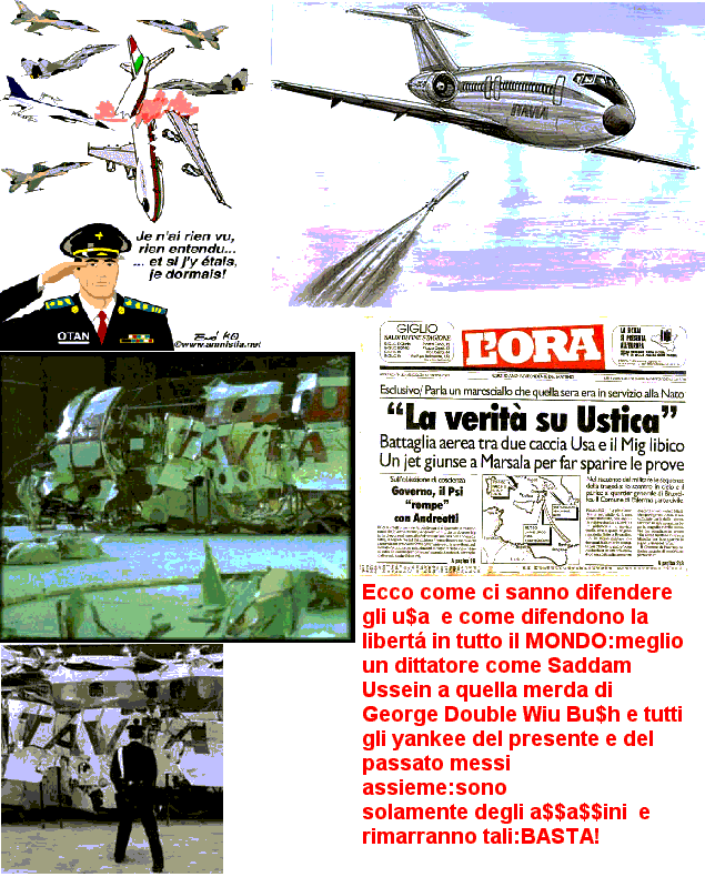 Le 27 juin 1980 un avion de ligne de la compagnie italienne Itavia avec 81 passagers à bord qui effectuait la liaison entre Bologne et Palerme précipita dans des circonstances mystérieuses. Tous les passagers et tous les membres de l'équipage trouvèrent la mort. Nous savons aujourd'hui avec certitude qu'il ne s'agit pas d'un accident. Nous savons aujourd'hui qu'un confit aérien eut lieu au-dessus de la Méditerranée entre des avions de l'Otan et des avions libyens. 20 ans après les faits, le juge italien Priore dénonce: "Il y a eu un acte de guerre. Il y a eu une opération de police internationale du ressort des grandes puissances." Une belle brochette de hauts gradés italiens ont été mis en examen pour attentat aux organes constitutionnels, concours en haute trahison et faux témoignage.