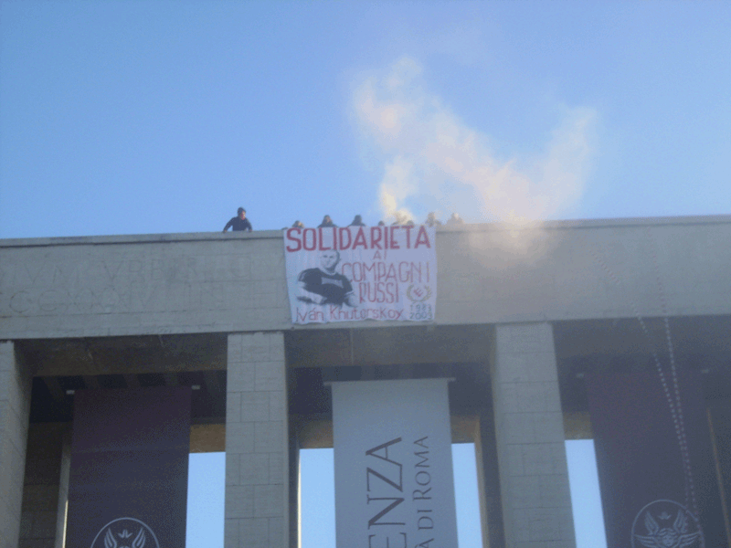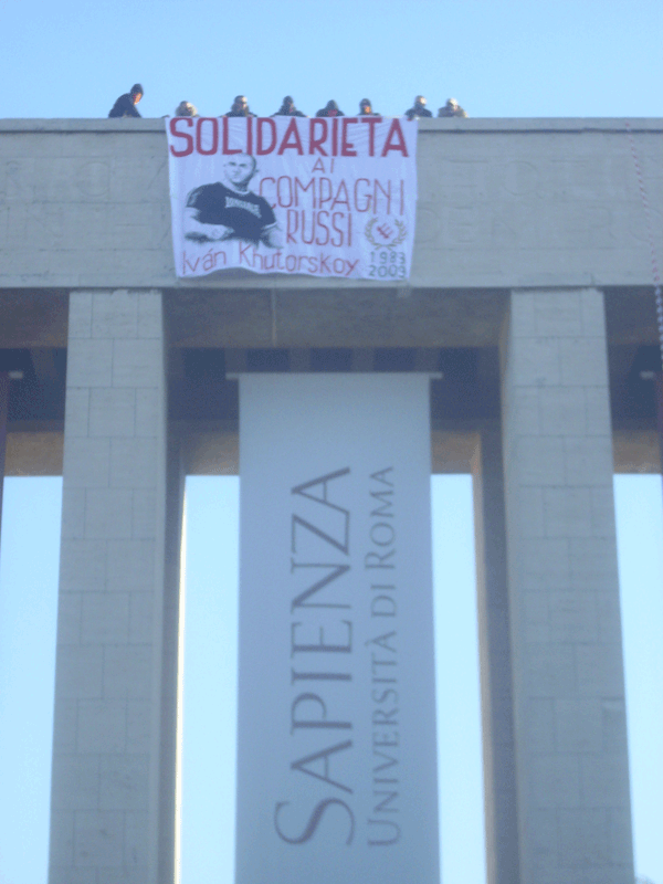 Questa mattina la RASH Roma ha voluto portare solidarietà ai Compagni russi in lutto, alcuni nostri militanti hanno calato uno striscione in memoria di Ivan Khutorskoy dalla facciata dell’univeristà la Sapienza prima della partenza del corteo studentesco concentratosi nel piazzale sottostante.