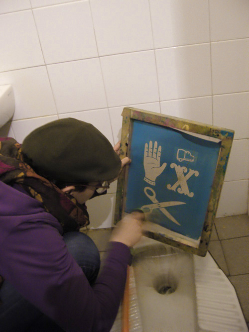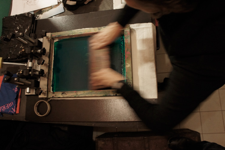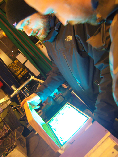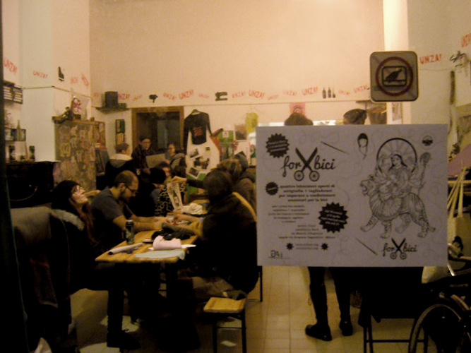 Ancora molto partecipata la seconda serata dedicata alle bici + serigrafie + taglia&cuci, avvenuta ieri alla ciclofficina Unza!. Insieme abbiamo sperimentato il procedimento per impressionare i disegni dei partecipanti dalla pellicola al telaio — già spalmato di gelatina fotosensibile, ben asciugata dal giorno prima — con l’ausilio del bromografo autocostruito dagli operosi amici La Sericletta, che gestiscono la cicloffina durante le domeniche e il laboratorio di serigrafia nei martedì sera.