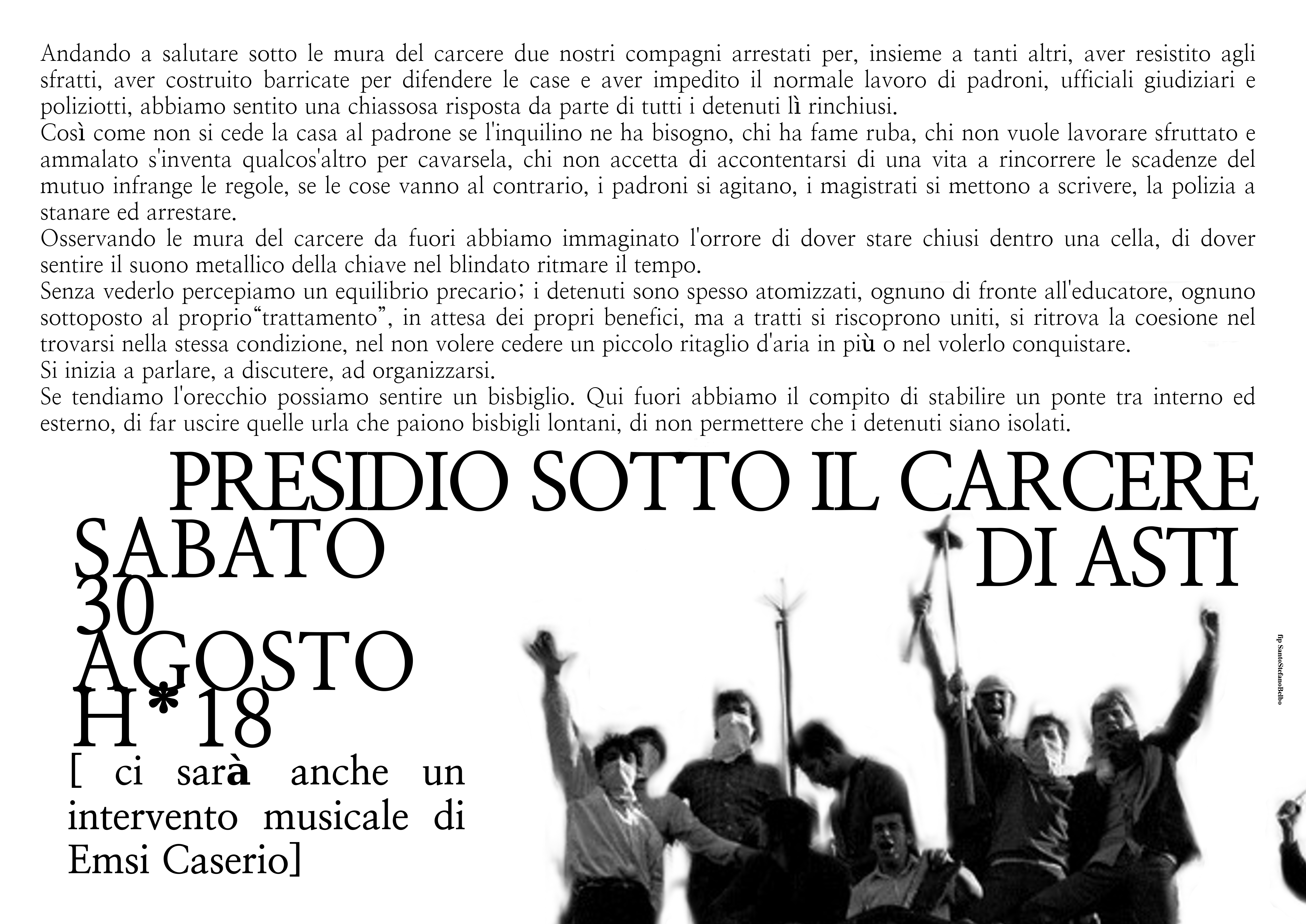 Il presidio sarà Sabato 30, l’appuntamento è alle ore 18 sotto il carcere di Asti, strada Quarto Inferiore 266.