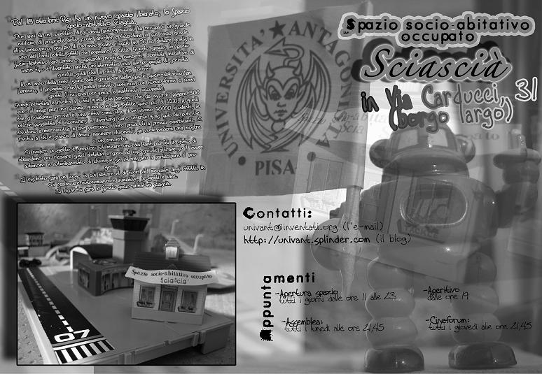 Dal primo ottobre Pisa ha un nuovo spazio liberato, lo Spazio socio-abitativo Sciascià. Un anno fa un collettivo di studenti autorganizzati ha occupato per un anno un grande edificio, di proprietà della scuola Sant’Anna, facendone la sua casa. Grazie all’autorecupero, per più di un anno, siamo riusciti in 50 ad abitare gratis in uno dei tanti edifici sfitti che popolano la città. Questo spazio, lo Spazio Socio-Abitativo San Lorenzo, ospitando mostre, concerti, dibattiti, iniziative di vario tipo è diventato anche un’alternativa viva alle proposte di socialità succhia-soldi che la città di Pisa “offre”.