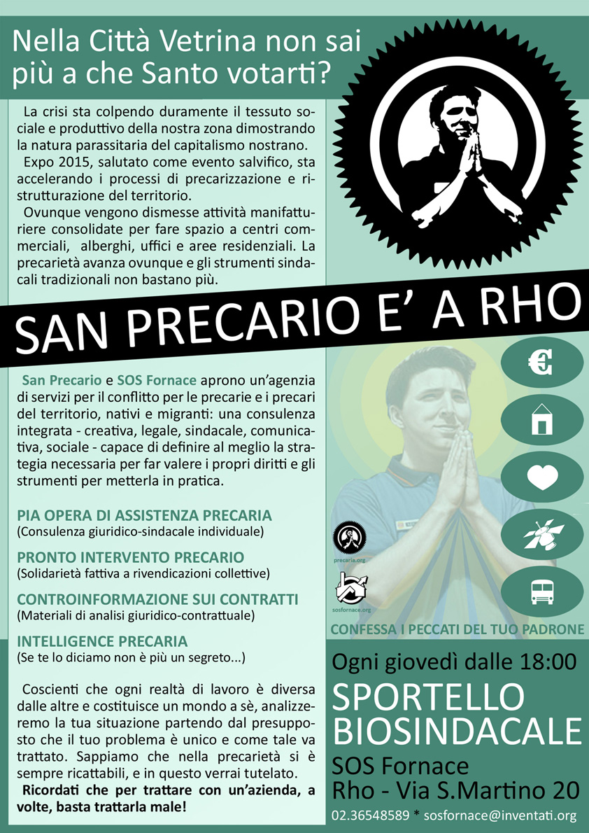 Giovedì 28 gennaio H18: San Precario starter-kit. come impostare e dar vita a una vertenza sindacale: strategie, strumenti e aspetti giuridico-legali. Uno starter-kit a cura dello sportello biosindacale per costringere il tuo padrone alla resa! Con la partecipazione dell’avvocato del lavoro Massimo Laratro