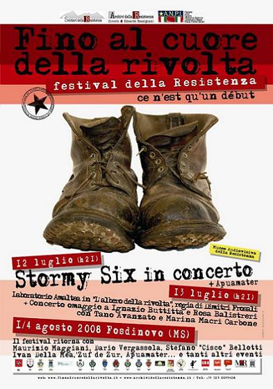 Sabato 12 luglio (ore 21) ci sarà un concerto-evento del Stormy Six; un ritorno davvero speciale, che inseguivamo da anni. Il mitico gruppo del rock progressivo italiano, firmò nel 1975 uno dei più bei dischi dedicati alla Resistenza: “Un biglietto del tram”. Apertura del concerto degli Apuamater di Davide Giromini).