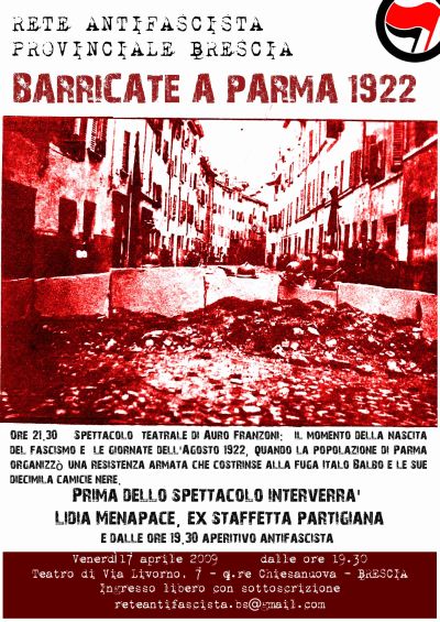 La Rete antifascista provinciale di Brescia ha tra le sue finalità la diffusione della memoria storica dell’antifascismo e la lotta al revisionismo politico che mira a parificare vittime e carnefici, fascisti e antifascisti. Pertanto si impegna ad organizzare incontri, dibattiti e momenti culturali che vadano ad attualizzare e a veicolare una memoria molto spesso taciuta o dimenticata. In quest’ottica si colloca la realizzazione di questo spettacolo teatrale che mira a disseppellire la storia degli Arditi del popolo, fondati nel giugno 1921 da Argo Secondari, col preciso intento di difendere le istituzioni popolari colpite dallo squadrismo fascista. Gli Arditi del popolo divengono, nel giro di poche settimane, un'organizzazione ramificata a livello nazionale. Vi aderiscono migliaia di giovani e di lavoratori di varia tendenza politica (comunisti, anarchici, socialisti, repubblicani, sindacalisti rivoluzionari, ma anche cattolici e dannunziani) che vedono nel movimento un efficace strumento di opposizione alla violenza delle camice nere. Le vittoriose difese di Viterbo e Sarzana dagli attacchi fascisti, organizzate dagli Arditi del popolo dei due centri, disorientano e cominciano a incrinare quella che sembrava una compagine imbattibile: i due fascismi, quello urbano (più politico e disponibile alle trattative) e quello agrario (ferocemente antiproletario e irriducibile ad ogni compromesso), sono ad un passo dalla scissione. Ma, violentemente osteggiata dal governo presieduto da Bonomi, la prima organizzazione antifascista non riceve - eccezion fatta per i terzinternazionalisti del PSI e l'area libertaria - il sostegno dei gruppi dirigenti delle forze del movimento operaio. Ormai ovunque semidistrutti, solo in pochissime realtà (tra le quali Parma, con le sue memorabili cinque giornate) gli arditi del popolo riusciranno a opporsi efficacemente all'offensiva finale fascista.