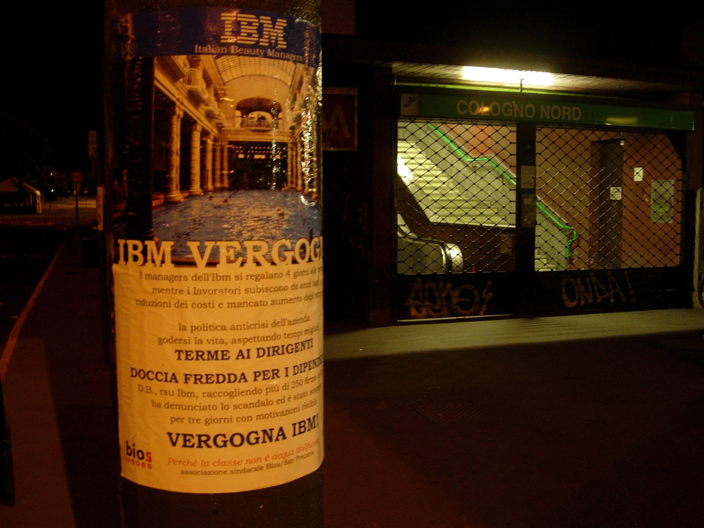 Nel mese di febbraio L’ibm Italia paga un soggiorno termale ad una cinquantina dei propri managers (con famiglie annesse) proprio quando l’emergenza crisi infuria ovunque. Una vacanza premio di quattro giorni tutta pagata con i soldi dell’azienda, mentre i lavoratori da tempo non ricevono aumenti di stipendio e subiscono di continuo riduzioni dei costi (che si traducono in peggiori condizioni di lavoro) L’indignazione si concretizza con una raccolta di firme promossa dall’rsu Davide Barillari su facebook che raccoglie nell’immediato centinaia di firme. La notizia buca i media, (la repubblica) e il management dell’IBM naturalmente non ne gioisce. Iniziano le intimidazioni rivolte ai firmatari e il promotore della protesta viene monitorato poi sanzionato per aver mandato delle comunicazioni sindacali durante l’orario di lavoro e per l’utilizzo improprio degli strumenti aziendali.