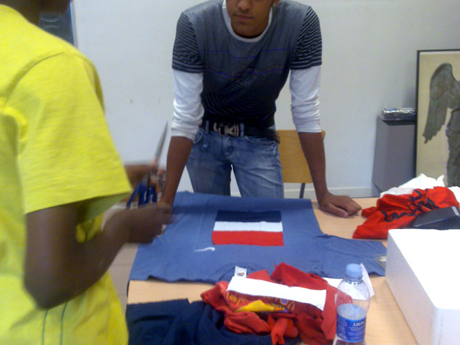 Durante il secondo laboratorio, i ragazzi spesso non si sono limitati ad usare gli stencil già esistenti, ma hanno chiesto di farne di nuovi (coi loro nomi) e di cucire applicazioni di stoffe sulle magliette (un ragazzo, di origine serba, ha voluto mettere i colori nazionali serbi sulla sua maglietta modificata).