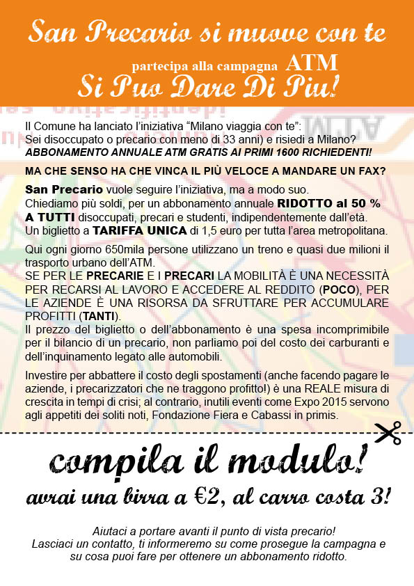 E’ necessario favorire e ricomporre questa conflittualità differenziata, unire i diversi rivoli per creare un torrente impetuoso e una cascata in grado di travolgere la diga del disegno politico-finanziario che sulla pelle dei precari e delle precarie vuole ribadire e mantenere il proprio potere, la propria ricchezza e garantire la propria perpetuazione. Già la manifestazione del 31 marzo a Milano ha rappresentato un segnale positivo e necessario, anche se non sufficiente per favorire questa ricomposizione sociale.