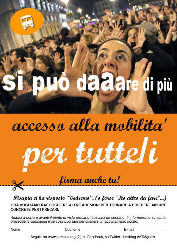 E’ necessario favorire e ricomporre questa conflittualità differenziata, unire i diversi rivoli per creare un torrente impetuoso e una cascata in grado di travolgere la diga del disegno politico-finanziario che sulla pelle dei precari e delle precarie vuole ribadire e mantenere il proprio potere, la propria ricchezza e garantire la propria perpetuazione. Già la manifestazione del 31 marzo a Milano ha rappresentato un segnale positivo e necessario, anche se non sufficiente per favorire questa ricomposizione sociale.
