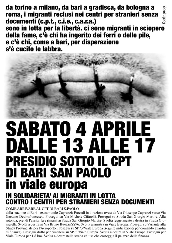 Sappiamo che da giovedì 5 marzo 2009, i migranti rinchiusi nei CPT/CIE di Bari San Paolo e Palese hanno iniziato uno sciopero della fame per protestare contro l’allungamento dei termini di reclusione in questi centri da 2 a ben 6 mesi, previsto dal “Pacchetto Sicurezza” appena approvato dal governo. Nonostante la crisi, dunque, il governo sceglie di investire una barca di soldi per infierire sul nuovo nemico della “brava gente”, oggi i migranti domani chissà chi.
