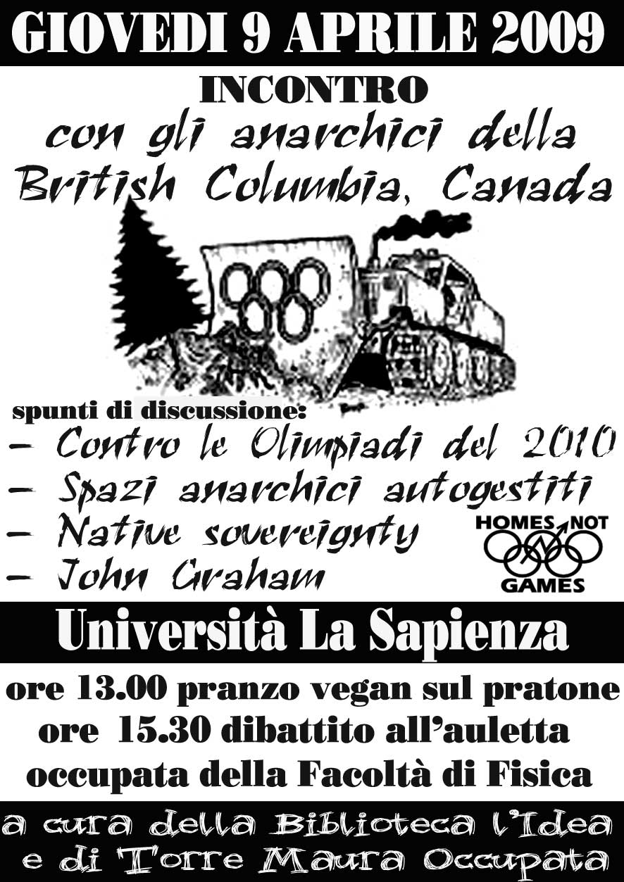 Giovedi 9 aprile 2009 Incontro con gli anarchici della British Columbia Canada Spunti di discussione: - Contro le olimpiadi del 2010 UNIVERSITA DELLA SAPIENZA (Roma) Ore 13.00 pranzo vegan sul pratone Ore 15.30 dibattito all’auletta occupata della Facolta di Fisica A cura della Biblioteca l’Idea e di Torre Maura Occupata Scarica il flyer Start: 18:00