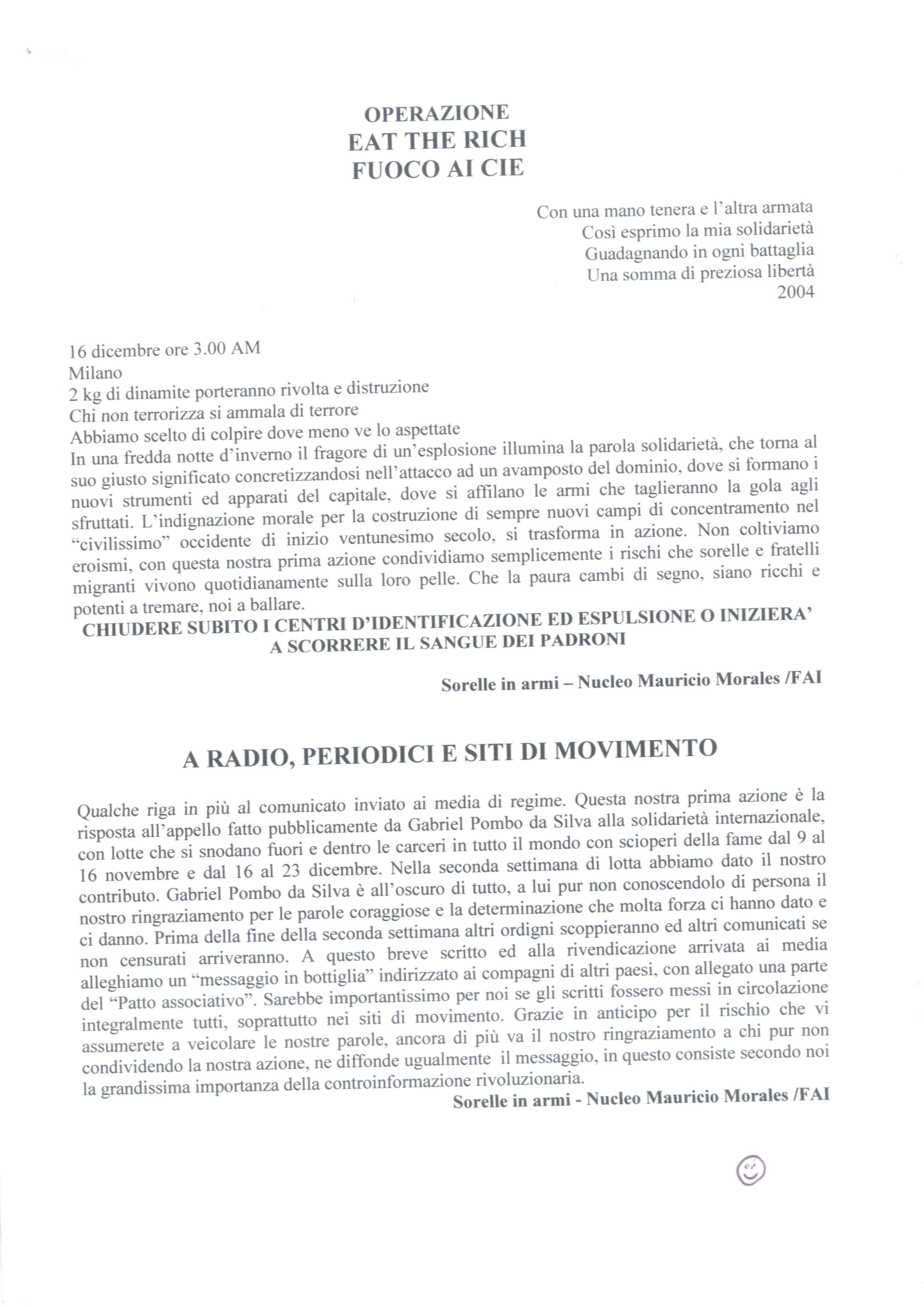 Pubblichiamo la scansione di un documento pervenuto per via epistolare nei giorni scorsi a diverse realtà anarchiche e di movimento in giro per l'Italia