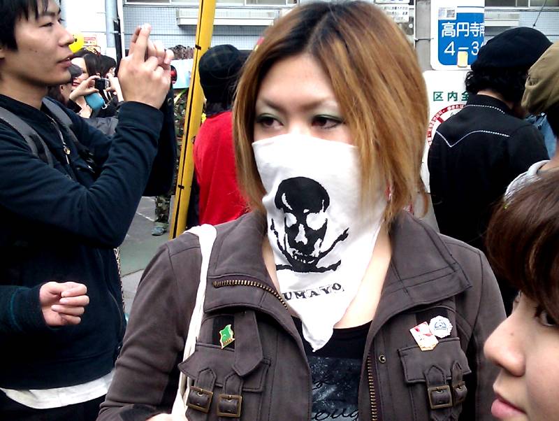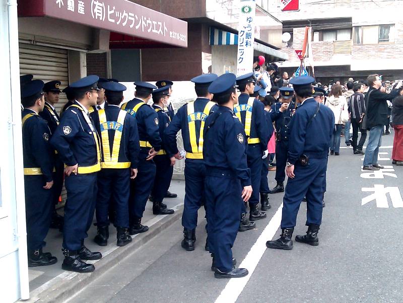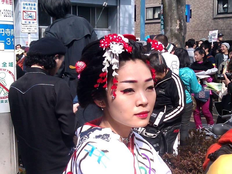 Giornata di sole, molte le famiglie e le persone per la prima volta in piazza a Koenji, quartiere fuori Tokyo, ma noto per la presenza di attivisti che vivacizzano da sempre la zona. Apertura punk del corteo (ma in testa a tutto una macchina della polizia, a controllare che tutto filasse liscio), chiusura più freak con soundsystem reggae: in mezzo c’era di tutto. La manifestazione è stata tagliata in più parti dai poliziotti, postisi come cuscinetto. Il corteo era quindi spezzato in sei o sette tronconi e in questo modo le persone hanno sfilato più raccolte a bordo della strada, consentendo di non bloccare il traffico.