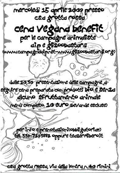 Cena vegan benefit per Campagna AIP Venerdì 17 aprile 2009 - ore 20.00 Per prenotazioni: laboratorioantispecista@yahoo.it o 340-6368139 Per maggiori informazioni sul posto che ci ospita: www.villapallavicini.org ************* Ancora una volta ci troveremo seduti a tavola con del buon cibo vegan, ottenuto Negli ultimi anni AIP è riuscita ad ottenere risultati importanti contro il In questo momento AIP sta portando avanti una campagna internazionale contro il AIP è gestita completamente da volontari e per finanziare la continua stampa Vi invitiamo dunque a passare una bella serata con noi, a mangiare insieme e a Vi invitiamo a prenotare il prima possibile per facilitarci nella preparazione ***Laboratorio Antispecista*** Start: 21:00