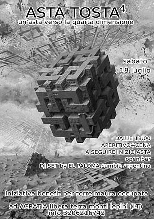 Sabato 18 Luglio iniziativa benefit per Torre Maura Occupata. dalle ore 18.00 aperitivo + cena, a seguire asta benefit. Dj set by El Paloma (Cumbia argentina) Ad Acratia libera terra sui monti Lepini info: 320-6216742