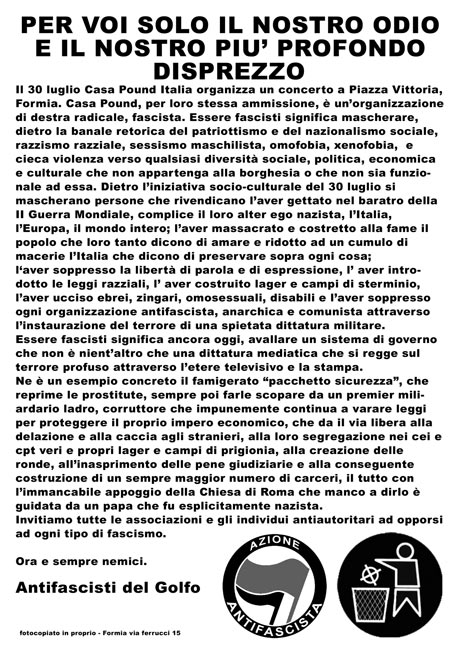 Il 29 luglio si è svolto a Formia un presidio Antifascista in risposta al concerto organizzato da Casapound il giorno dopo. Presenti numerosi solidali, è stato distribuito tra gli altri il volantino in allegato.