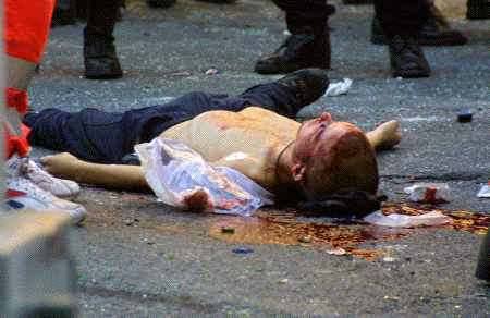 Carlo e' a terra e il cuore sta smettendo di battere. I manifestanti arretrano