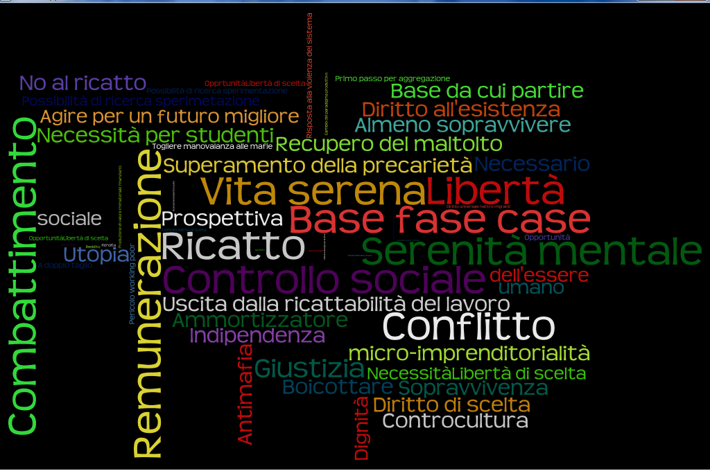 Reddito come strumento di libertà e di giustizia. Un modo per uscire dal ricatto e per muoversi verso una prospettiva futura. Quindi libertà, giustizia, conflittualità, azione, futuro, vita serena, tranquillità, possibilità di programmare, possibilità di seguire i propri desideri. Attacco e difesa sono tra loro molto legati ma certamente il reddito apre nuove possibilità e sostiene l’azione. Quindi la polarità attacco con i suoi tanti significati è quella prevalente. L’azione, il cambiamento, la possibilità di dare una forma al proprio futuro aprono la strada a una riflessione sul reddito come occasione per un ripensamento del modello produttivo, cioè del modo con cui si produce e si distribuisce la ricchezza. Il reddito fa emergere la differenza tra il valore delle cose e il valore del capitale.