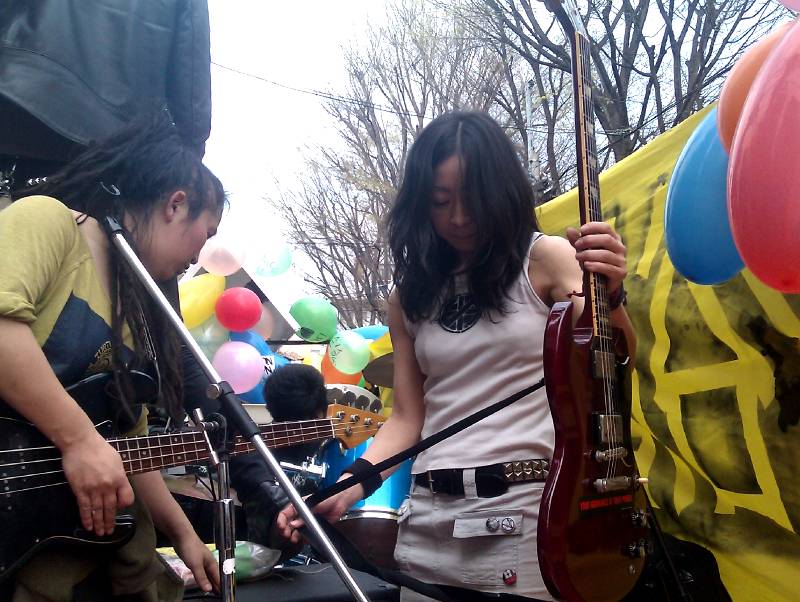 Giornata di sole, molte le famiglie e le persone per la prima volta in piazza a Koenji, quartiere fuori Tokyo, ma noto per la presenza di attivisti che vivacizzano da sempre la zona. Apertura punk del corteo (ma in testa a tutto una macchina della polizia, a controllare che tutto filasse liscio), chiusura più freak con soundsystem reggae: in mezzo c’era di tutto. La manifestazione è stata tagliata in più parti dai poliziotti, postisi come cuscinetto. Il corteo era quindi spezzato in sei o sette tronconi e in questo modo le persone hanno sfilato più raccolte a bordo della strada, consentendo di non bloccare il traffico.