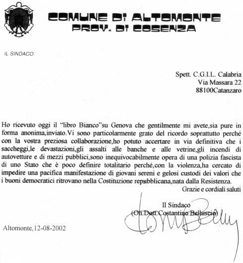 Ricevo, per il tramite del mio difensore Avv. Vittorio Colosimo, presso il cui studio è stata indirizzata, la Sua lettera con la quale mi comunica l'impegno dell'Amministrazione Comunale di Altomonte perché io sia l'«assunto n.1» nelle industrie che si stanno insediando nel Vostro Comune.