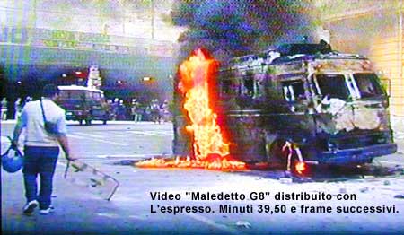 Apprezzo molto lo sforzo per ricostruire gli avvenimenti di Piazza Alimonda. Contesto ovviamente alcuni commenti e ricostruzioni: a) accettare che un poliziotto possa rimanere scioccato davanti ad un cadavere, è già un grande passo, anche se personalmente penso che forse (non possiedo il video citato), rimanendo con almeno un piede d'appoggio e compiendo una rotazione per prendere la scatola dei filtri (confermo che è una scatola per filtri, non si capisce bene il modello della maschera, ma le dimensioni e il packagin, e il peso possano essere compatibili), le ginocchia, il sinistro in evidenza, abbiano potuto assumere quella posizione; b) interessanti sono le interpolazioni con i figuri in nero in combutta con la Polizia. c)il vilipendio di cadavere, mi sembra esagerato altrimenti come volontario di C.R.I. avrei vilipeso un centinaio di persone; d)il contenuto delle tasche, come la liberazione del corpo di un ferito, è uno dei primi punti da seguire. Mettiamo caso che il paziente possa essere diabetico od allergico a farmaci, le informazioni personali stanno comunemente nel portafoglio. Beati luoghi comuni. Ma Carlo Giuliani non aveva i documenti... e) la pietra, come il movimento morenico dell'accendino e delle care vecchie diecimila lire posso imputarle al caso. Di certo, una pietra del genere suppongo sia insufficiente a spezzare uno zigomo, ferita compatibile alle perdite di sangue, anche se troppo copiosa. f)una cosa che non riesco ancora a capire è dove cavolo ha preso quell'estintore. Altra osservazione, lo scotch da pacchi a che cavolo gli serviva. Dalle foto si evince che lo aveva da poco (tutto bello lindo, e le sue mani no; tutto bello sudato, e neanche un alone sul cartone interno; e non è neanche ovalizzato). Sarà servito a qualcos'altro? g) non viene preso in considerazione che i componenti del Defender, che avevano le protezioni personali ma non il casco. Io, oggettivamente, avrei avuto paura di trovarmi sul Defender, in tre, tagliato fuori dalla avanguardia del corteo. E dentro un Defender non è che hai troppa libertà di movimenti, per difenderti od onestamente fuggire. Forse anch'io avrei sparato: avrei esploso tutto il caricatore. E l'unico appunto che vi faccio è questo: ma se fosse morto Placanica od il suo collega o l'autista, qualcuno sarebbero riuscito a trovare Carlo Giuliani? Una domanda di cultura generale: il giorno precedente io avevo accompagnato un paio di giornalisti svizzeri per Corso Torino e zone limitrofe, e passammo alcuni minuti prima della foto della camionetta incendiata. La cosa che mi ha colpito è perchè la stragrande maggioranza dei giornalisti stranieri si era portata dietro elmetti in kevlar, giubbotti anti taglio, ed altre minuzie e quelli italiani, no? Che immagine aveva il movimento al di fuori dell'Italia, e che immagine dava l'Italia per la preparazione del G8? Un'altra domanda-tesi: per la gente che ho incontrato in quella zona durante gli scontri, mi sono fatto l'idea che se dovevano esserci delle forze occulte erano tutte fuori dall'Italia. O meglio, scegliete voi l'Agenzia che vi sta più a cuore e scegliete il gruppo sedizioso corrotto preferito, metteteli assieme e portateli a Genova. Io penso che anche le stesse Forze dell'Ordine siano "sbandante", trovandosi gruppi di resistenza e di inermi a fasi alterne. Poi tanto nel casino, c'è sempre qualcuno che si aggiunge. Grazie ancora per il lavoro svolto, ma vi chiederei di essere un po' più obiettivi nei giudizi, tanto avete la certezza che non si scoprirà mai la verità! Viva l'Italia!