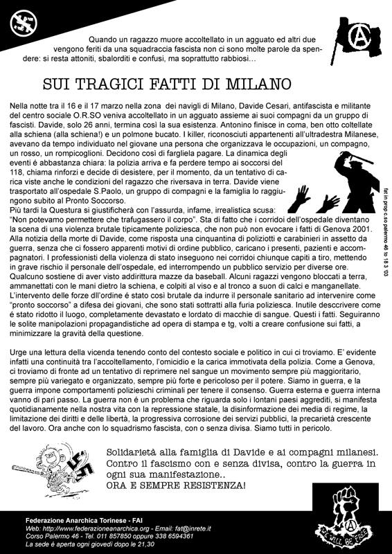 non per essere puntiglioso,ma questo ragazzo, che aveva i miei stessi pochi anni, è stato assassinato con premeditazione per mezzo di un aggressione, non di una rissa tra beoni, e morire così, neanche cercando di salvare una principessa o un ideale, fa solo più male ancora. Forse in questo momento sarebbe utile un pensiero alla sua bimba, più che alla forma di un volantino.