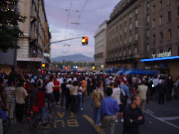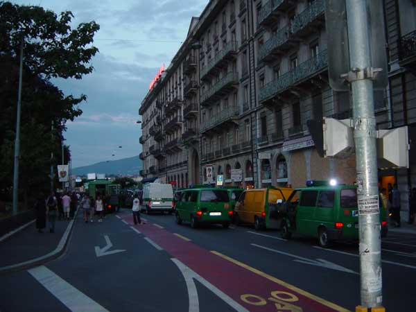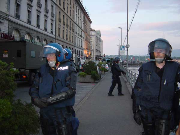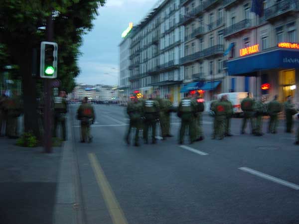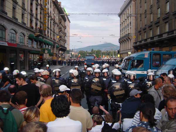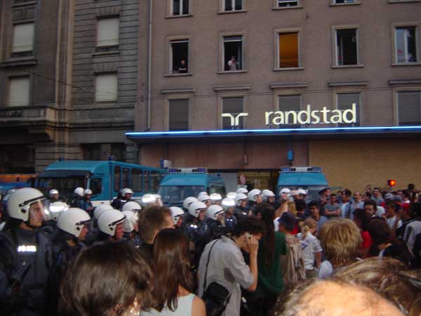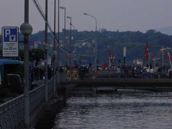 la polizia ha imprigionato sul ponte un gruppo di manifestanti, alcune centinaia, che stavano bloccando il ponte in segno di protesta, lo stesso ponte su cui l'amministrazione cittadina ha messo a sventolare le bandiere della pace, della nazione e del comune...