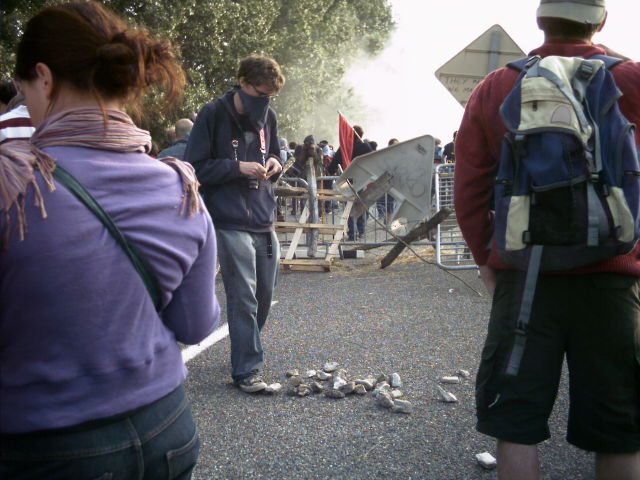 la risposta della polizia all'aggiramento del blocco sulla strada secondaria è imponente: un centinaio di poliziotti avanzano con fare minaccioso e costringono il gruppo ad arretrare dietro la barricata costruita. Il gruppo costruirà una seconda barricata più arretrata.
