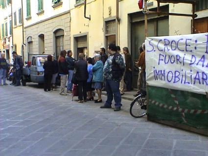 SARA NON SI TOCCA- SANTA CROCE E' ZONA ROSSA PER UFFICIALI GIUDIZIARI E POLIZIA!!!! Da alcuni mesi gli abitanti di Santa Croce stanno materialmente bloccando tutti gli sfratti nel loro quartiere, le cause ele ragioni del blocco sono molteplici: 1)il quartiere ha visto l'allontanamento di migliaiia di abitanti, la rottura di relazioni sociali, la costante speculazione sugli alloggi a nero. Da oltre venti anni terreno di conquista di moderni spacciatori del business. 2)Da tempo siamo abituati a prese di giro. Il Consiglio Comunale, i consigli di Q, i partiti politici(più o meno tutti)hanno sprecato promesse e parole, hanno parlato a vanvera di ripopolamento del territorio, di riportare la residenza in centro. QUANTE PAROLE AL VENTO QUANTO FIATO SPRECATO 3)Il mondo oggi è regolato dai profitti. Il battito del cuore parla unicamente il linguaggio del denaro. Il liberismo moderno ha costruito enormi disuguaglianze nel mondo come a Firenze. Per chi vive del proprio salario o della propria pensione solo qualche miseria di contributo dell'assistente sociale. 4)Le privatizzazioni selavagge hanno devastato ogni attimo della vita :SANITA', CASA, ACQUA, TRASPORTI, FARMACIE, E PER ULTIMO I CIMITERI.