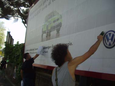 Sabato mattina si è svolta una azione di de-automobilizzazione a Magliana. Sui cartelli attaccati sulle pubblicità c'è scritto: "L'automobile nuoce gravemente alla salute" "L'utilizzo di petrolio provoca guerre" "Spazio de-automobilizzato." --------------------------------------------------