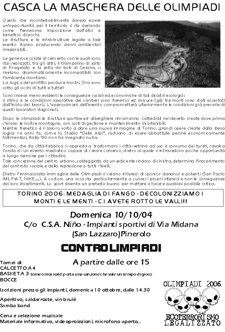 Dietro l’immacolata immagine delle Olimpiadi si celano interessi di sponsor danarosi e potenti (San Paolo IMI, FIAT, NIKE,…). A costoro una cosa sta particolarmente a cuore: i propri interessi e non le conseguenze dei loro investimenti. Lo sport diventa un pretesto buono per mettere a tacere qualsiasi possibile critica.