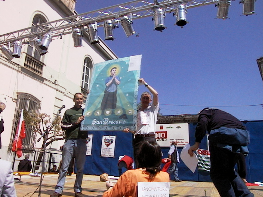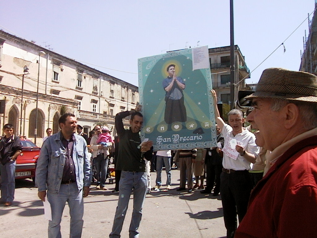 Festa del primo maggio alternativo a Nocera Inferiore - Colazione equobioeco -Apparizione di San Precario nel mezzo della manifestazione "ufficiale" dei Confederali e delle istituzioni locali - Recita della Preghiera di S. Precario - "Assalto" al palco